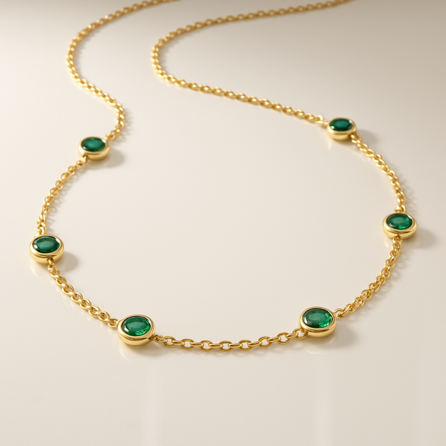 An elegant yellow gold emerald station chain necklace crafted with fine materials, designed to be timeless and sophisticated.